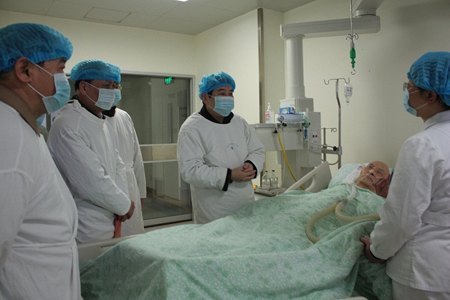 “苏老,苏老。”在重症监护室,心电图机“滴滴”地响着,穿上隔离服的高文兵书记来到苏玉清的床前,深情地呼唤苏老。苏玉清老同志经历过战场上的血雨腥风,后又任中南矿冶院任党委副书记一职为学校的事业鞠躬尽瘁。医护人员介绍说99岁高龄的苏老目前肾脏功能衰竭,心脏及几个主要器官也遇到了障碍,必须依靠人工设备才能维持基本的功能运作。为了让苏老更好地休息,大家没有逗留很久,领导们把学校的慰问金送到了苏老小女儿的手上,“学校就是苏老的第二个家,我们都等着给他一起过百岁寿辰。”