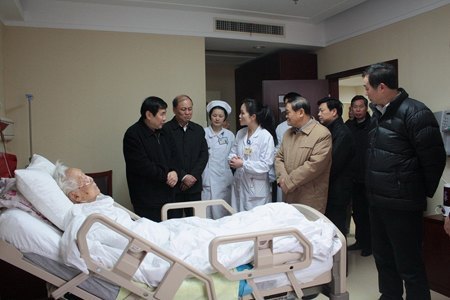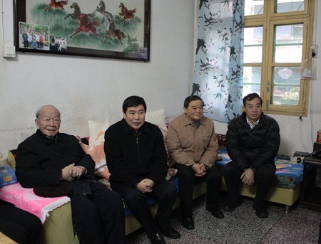 1月17日,正值南方的小年,长沙冷风刺骨,校园里却早已张灯结彩,洋溢着新年的喜庆。校党委书记高文兵、常务副校长黄健柏、党委副书记徐建军率领办公室、组织部、人事处,离退休工作处相关部门负责人奔波于长沙城的各大医院和家属职工楼间,先后走访慰问了苏玉清、蒲润、鲁恩赐、黄培云、李泉龙五位老同志。