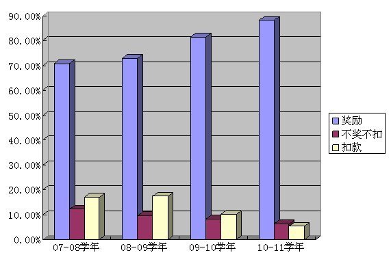 四年的实践证明:绩效考核制度的建立,激励教师发掘潜力,开拓创新、不断进取。在绩效考核的导向下,广大教师踊跃承担教学工作、招收研究生,积极进行教研教改、努力提高人才培养质量,申报国家级科学研究项目、发表高质量文章、获得省部级成果奖的人数日益增长。教师工作积极性的提高,推动了学校又好又快发展,提升了学校的竞争力和影响力。四年来,广大教师辛勤的工作促进了学校的发展,也受益于学校的发展。随着获奖教师比例不断的上升,学校投入绩效奖励的额度也不断刷新。“办学以教师为本”,一系列的数据充分体现了学校对教学、科研一线工作者的倾斜,也为进一步营造有利于优秀人才脱颖而出的良好环境,实施人才强校战略打下了更加坚实的基础。