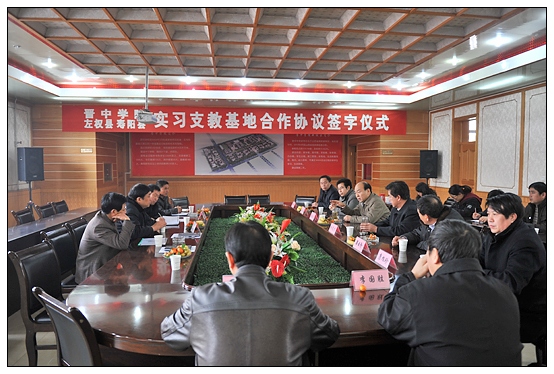 1月12日,晋中学院在三楼会议室同左权县教育局、寿阳县教育局签订实习支教基地合作协议。晋中学院党委书记解根法参加签字仪式并作了讲话。同时参加签字仪式的还有晋中学院副院长杨高才、副院长柴达,党委委员、组织部长梁云阶,党委委员、院办主任卫二平,资产处长康旭珍,下乡实习支教的带队老师吕河频、李国胜等。左权和寿阳教育局领导对晋中学院设立学生实习支教基地的做法表示欢迎。