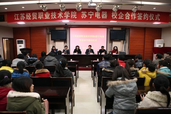 苏宁电器人力资源管理中心总监助理李岩松对苏宁电器的发展历史、背景文化作了简要概述。她强调苏宁作为中国民营企业前三强,首次与江苏经贸职业技术学院进行深度校企合作,双方在四个方面达成共识:一是专业共建,每年成立两个苏宁班,“苏宁销售工程师定向班”和“苏宁物流专业人才定向班”;二是共建基地“苏宁电器南京公司员工培训基地”和“江苏经贸职业技术学院大学生实习实践就业基地”;三是设立“苏宁奖学金”;四是共建教师交流工作站。在校企共建、共管、共育、共培新理念的引领下,探索新型人才培养模式。