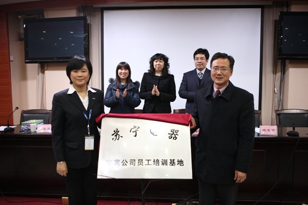 最后,苏宁电器人力资源管理中心总监助理李岩松和薛院长签订了校企合作合约,并为“江苏经贸职业技术学院大学生实习实践就业基地”揭牌。苏宁电器南京大区人力资源部经理邹冬萍和工商管理系党总支书记周志平共同为“苏宁电器南京公司员工培训基地”揭牌。