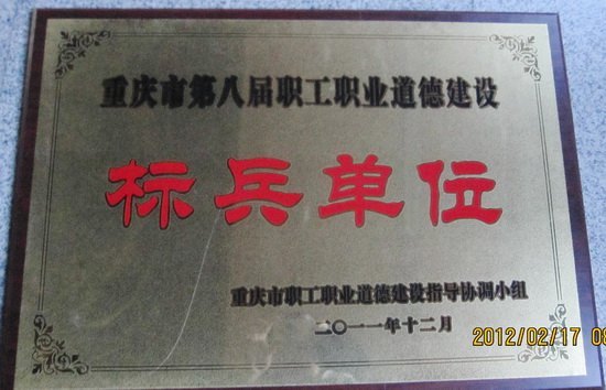 为深入开展职业道德建设,推动企事业单位自觉履行社会责任,引导职工以先进人物为榜样,勤奋学习、爱岗敬业、诚实守信、踏实工作。由中共重庆市委宣传部、重庆市精神文明建设委员会办公室、重庆市国有资产监督管理委员会、重庆市人民政府纠风办和重庆市总工会组成的重庆市职工职业道德建设指导协调小组于2011年开展了重庆市第八届职工职业道德建设评选活动。经过组织推荐、审核上报、公示投票、重庆市职工职业道德建设指导协调小组组织评审委员会进行无记名投票,重庆医科大学荣获“重庆市第八届职工职业道德建设标兵单位”,基础医学院汪维伟、附一院教务处陈鸿雁教授荣获“重庆市教育系统教职工职业道德建设标兵”称号,同时荣获重庆市总工会颁发 “重庆市五一劳动奖状”。 (校工会)