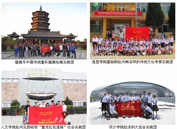 2011年6月26日至8月25日,中央美术学院共派出十个暑期实践团队、100余名团员,通过社会调查、志愿服务、观摩学习等形式,奔赴辽宁、河北、河南、广东、青海、甘肃、内蒙古及北京周边等多个地区开展内容丰富、形式多样的实践活动: