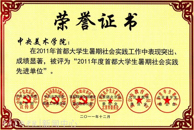 近日,中央美术学院在北京市委、市教工委和团市委联合举办的“2011年首都大学生暑期社会实践”评奖评优活动中,荣获“2011年度首都大学生暑期社会实践先进单位”称号。另有多人荣获“先进工作者”和“先进个人”称号,多个团队荣获“社会实践优秀团队”和“社会实践优秀成果”的表彰。