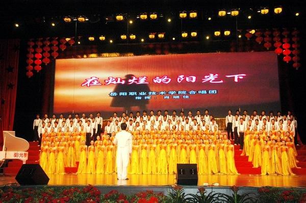 ??? 岳阳职业技术学院合唱团由院团委组织,在肖晓佳老师的指挥下,演唱了《岳阳职院之歌》和《在灿烂阳光下》两首歌。随着背景屏幕上展现岳阳职业技术学院校园风光的优美画面一幅幅出现,在轻快的旋律中,“洞庭的涛声呼唤我们,年轻的船队就要启航”、“锤炼学养,握紧时光”、“迎接明天壮丽的远航”表现了青春学子的奋发激情和崇高理想。“吃水不忘挖井人,曾经苦难才明白”,“在灿烂的阳光下,跟着共产党,建设大中国”,《在灿烂阳光下》抒发了对我们伟大的党、伟大祖国的深厚感情和永远跟党走的坚定信念,情深意浓,动人心扉,感人肺腑,难忘那往昔峥嵘岁月。