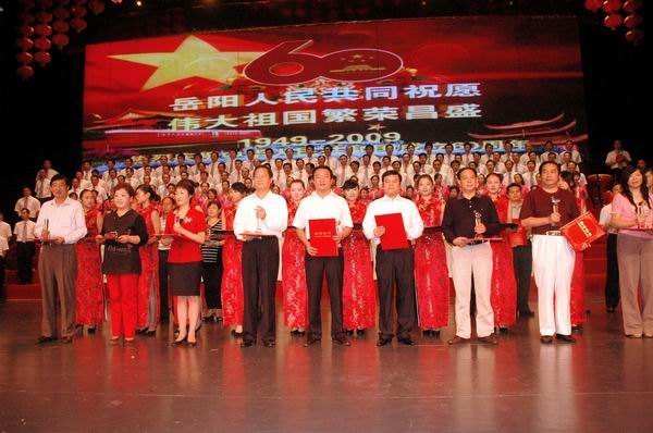 ??? 晚上,市文化艺术会展中心大剧场华灯璀璨,气氛热烈。舞台中央的背景屏幕上显现着“岳阳人民共同祝愿伟大祖国繁荣昌盛”的祝福语,令人自豪和振奋。