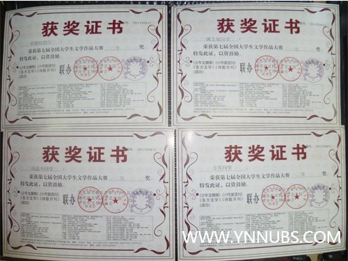 由全国大学生文学作品大赛组委会、湖北省文联文学艺术院、世界中文作家协会主办,《少年文摘报》、《小作家选刊》、《东方文学》、《诗歌月刊》、《成功》等多家单位联办的《第七届全国大学生文学作品大赛》成功举办,云南师范大学商学院中文系也积极组织学生参加此次比赛。通过系级初选和指导,共筛选出61名同学参赛,且均获优异成绩,其中二等奖4名、三等奖57名。特此祝贺!