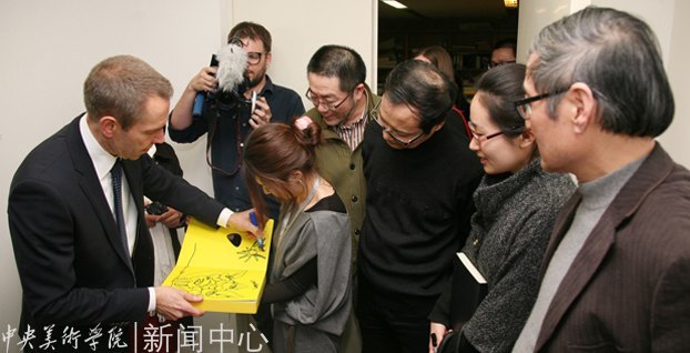 昆斯在中央美术学院美术馆出版的“超有机”画册上作画留念