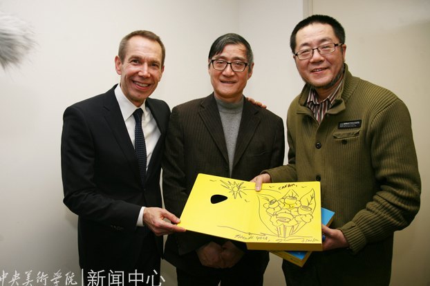 活动合影,从左至右依次为美国艺术家杰夫昆斯、中央美术学院院长潘公凯、中央美术学院美术馆馆长王璜生