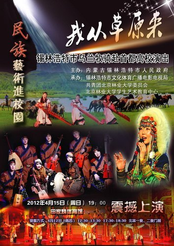 为更好的推进校园艺术文化交流,丰富校园文化内涵,使学生近距离了解民族音乐文化“我从草原来”锡林浩特市乌兰牧骑赴首都高校巡演将于2012年4月15日晚7点在北京林业大学田家炳体育馆上演。