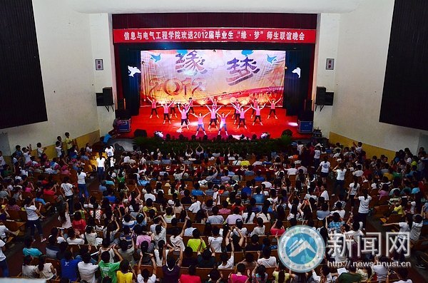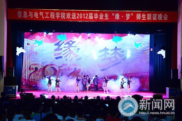 6月9日晚,信息与电气工程学院“缘·梦2012”欢送毕业生暨师生联谊晚会在俱乐部拉开帷幕。飞翔的白鸽带着金色的梦横挂在舞台中央,现场布置简单却热闹非凡,全场座无虚席。