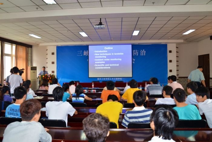 开幕式结束后,来自美国康涅狄格大学的刘澜波教授为现场师生作了题为《The Feasibility of Continuous Monitoring of Slope Stability with Ambient Noise Interferometry》的学术报告,并回答了现场师生展开了互动交流。土木工程学院的周廷强博士作了题为《万州滑坡监测预警现状分析》的学术报告;土木工程学院客座郝敏教授作了题为《三峡库区城镇防震减灾区划》的学术报告。当日下午,中国地震局刘启元研究员作了题为《关于地质灾害国家自然科学基金项目申报的若干问题》报告;学校电信息学院赖于树博士和土木工程学院程龙飞博士分别作了题为《护坡稳定性声发射监测技术》、《三峡库区库岸土袋护坡结构稳定性关键技术》的学术报告。
