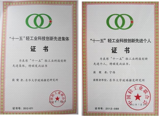 东华大学研究院玻璃搪瓷研究所荣获中国轻工业联合会“‘十一五’轻工业科技创新先进集体”称号