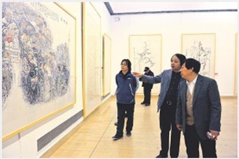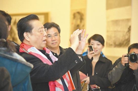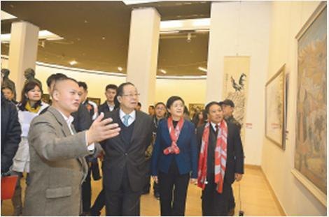 南艺美院院长张友宪向出席开幕式的领导和嘉宾讲解展品。