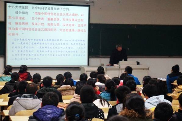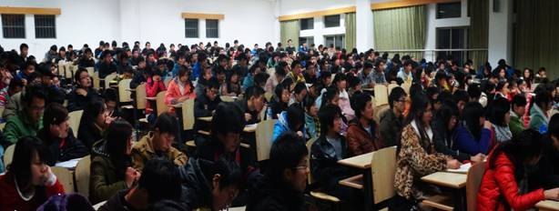 图为12月8日晚在教三103教室举行的思政课讲座《科学发展观和大学生成才》,学生听讲后撰写心得,将作为实践教学成绩之一,学生参加踊跃,学习认真。