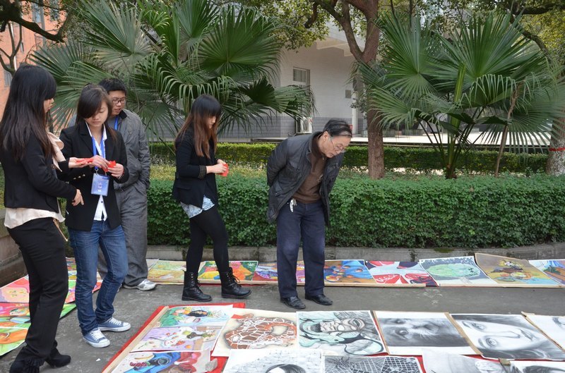 本次大赛共收到500余幅书画作品,作品一展就吸引了师生们眼球。12点30分整,罗先才、王新荣、王顺峰、常雁来、陈荣、张新龙等评委老师进场,初选开始。
