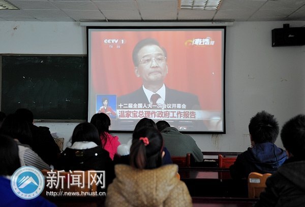 自3月3日全国政协十二次会议开幕以来,政协委员的一些提案引起了师生们的关注和热议。3月5日上午,温总理“极不平凡”的中国五年发展报告更是引起了师生们的广泛关注。湖南科技大学校团委、学生联合会为了让学生干部积极关注两会动态,特意组织学生干部在校团委会议室观看十二届全国人大一次会议。中华网、凤凰网、新浪微博、腾讯微博等网络信息通道更是成为师生关注两会最新动态和发表意见的热门渠道。随着网友们的热议,湖南科技大学师生也参与到教育发展、环境问题、经济形势等相关话题中“吐心声”。