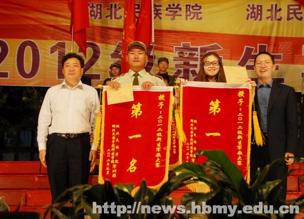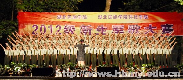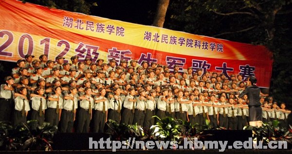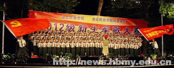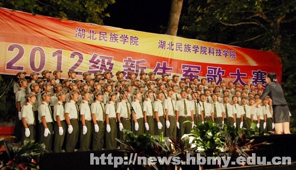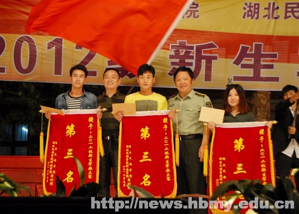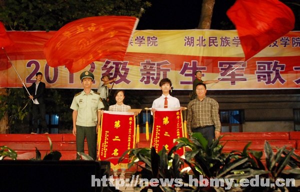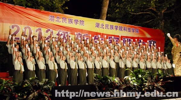 本网讯 9月13日晚,学校2012级新生军歌大赛在学校团结广场隆重举行。学校党委副书记吴建清现场观看了比赛并为获奖队颁奖。比赛得到了中国移动恩施分公司的大力支持,中国移动恩施分公司的相关领导也现场观看了比赛。