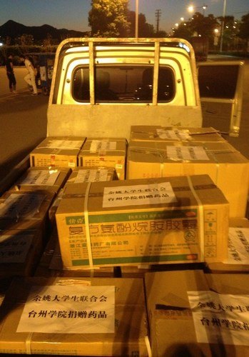 10月11日,物电学院志愿者配合余姚籍同学一起在椒江校区食堂及超市门口设立了两个募捐点。路过师生争先捐款,有的10元20元,有的50元100元,最多的一次捐了500元,当天就募集到了15500元善款。同学们还从各种途径了解了余姚当地急需药品目录,决定用募捐到的善款采购一批消炎、消毒药。最终买到了消毒零粉、蒲地蓝消炎片、红霉素软膏等药品及酒精棉花、纱布等医药用品,整整装了一车。