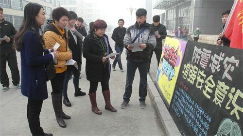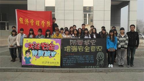 继吉林省松原市前郭尔罗斯蒙古族自治县发生5.5级地震后,为了普及防震减灾知识,进一步增强师生防震减灾和自我保护意识。2013年11月1日上午11:00,经济管理学院在大学生餐饮中心楼前举办了以“普及防震知识 增强减灾意识”为主题的防震减灾宣传活动。