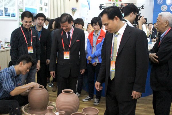 在智慧林业展馆中,海峡动漫学院现场表演了陶艺作品的制作。三明学院展台中还展示了师生陶艺和动画创意作品,海西(三明学院)园林景观规划与设计院士工作站简况,马尾松优良种质材料收集及定向选育研究、福建省石杉科植物资源、遗传多样性及其药用内生菌筛选研究、草珊瑚植物饮料产业化项目等林业科技成果。