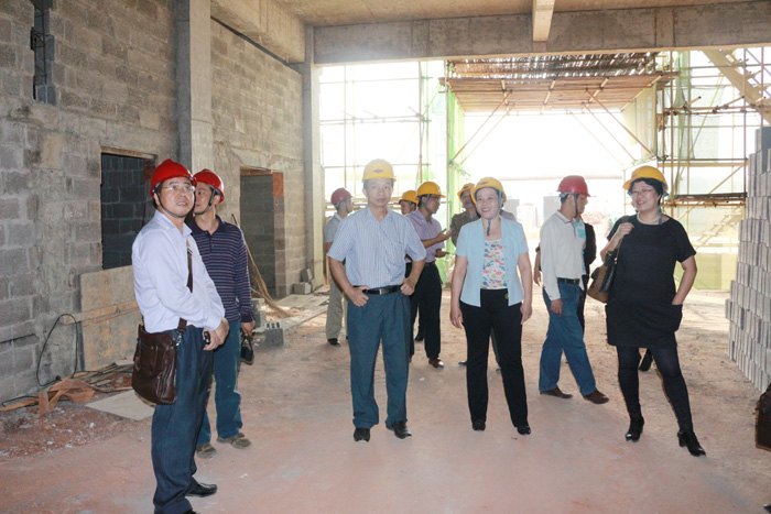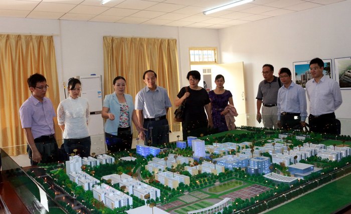 在五合校区建设指挥部模型室,邓艳葵副院长首先向督查组一行介绍了广西师范学院五合新校区的规划及一期工程进展情况。随后,督查组一行依次实地察看了学生食堂、教学楼、学生宿舍工程建设施工现场,详细了解新校区建设工作进展及施工现场情况。
