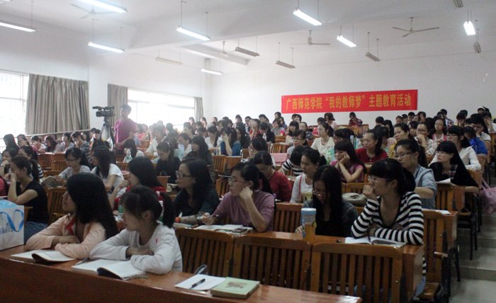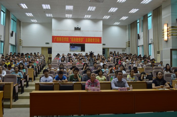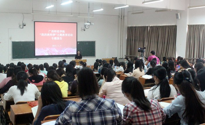 为了深入领会习近平总书记对“中国梦”的重要论述和致全国教师慰问信精神,展现广大教师热爱教育、献身教育的崇高精神,引导广大师范生树立教师职业理想,巩固专业思想,提高专业素养,11月5日下午,由广西教育厅主办的“我的教师梦”主题教育活动在广西师范学院明秀校区和长岗校区同时举行。