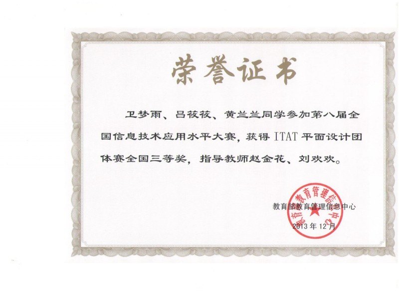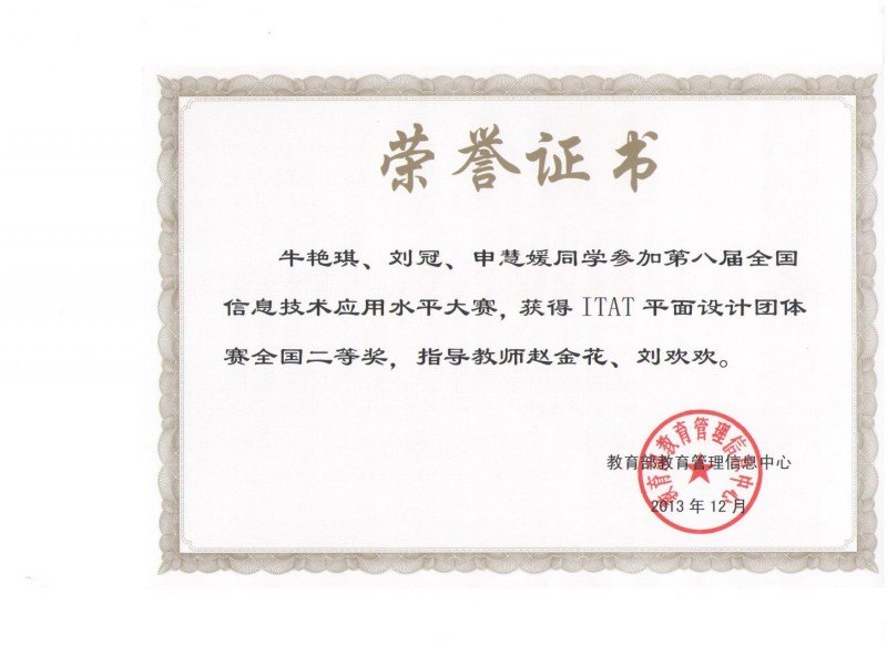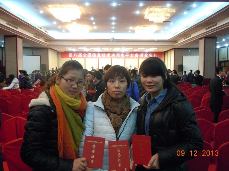 12月9日,由教育部教育管理信息中心主办的第八届全国信息技术应用水平大赛在北京落下帷幕。从大赛颁奖典礼上传来喜讯,软件工程系印刷图文信息处理专业2011级1班牛艳琪、刘冠、申慧媛同学荣获全国二等奖,2012级卫梦、吕筱筱、黄兰兰获得全国三等奖,赵金花、刘欢欢老师荣获“最佳指导教师”和“优秀指导教师称号”。