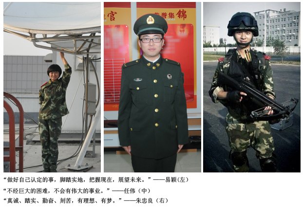近日,中央美术学院2011年参军入伍的三名大学生士兵陆续返校复学,他们分别是:人文学院2011级本科生易颖,城市设计学院2009级家居产品设计本科生任伟和城市设计学院2010级家居产品设计本科生朱忠良。三名学子在部队表现突出,多次受到嘉奖,得到部队充分肯定,其中易颖和朱忠良分别荣立个人三等功,为学院争得了荣誉。精彩的军旅生涯将成为他们生命中浓墨重彩的一笔,激励着他们不断向前迈进。