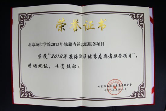 本次表彰大会对首都教育系统2013年度在志愿服务工作中做出突出贡献的先进集体和个人进行表彰,北京城市学院义工服务学校总会荣获“优秀志愿服务团队”称号,北京城市学院2013年铁路春运志愿服务项目荣获“优秀志愿者服务项目”称号,李佳蓁、冯翠营、刘晶晶三名同学荣获“优秀志愿者”称号。