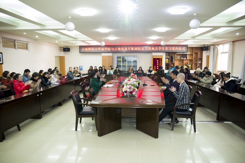 1月13日下午,云南省聂耳歌剧院与云南师范大学商学院实习基地签约仪式,在云南师范大学商学院慧宇楼102会议室隆重举行。云南师范大学商学院杜国海副校长、云南省聂耳歌剧院总经理、艺术总监舒洁先生、云南师范大学商学院艺术学院孙和林副院长、刘娅副院长、聂耳歌剧院工作人员、商学院艺术学院全体教师以及学生代表等出席了签约仪式。签约仪式由艺术学院陈明老师主持,会议在热烈隆重的气氛中进行。云南师范大学商学院杜国海副校长和聂耳歌剧院总经理舒洁先生分别致辞,双方都表示加强学校与企业的合作,互相支持、优势互补、资源互用、利益共享,是实现高等教育和企业创新相得益彰的良好途径,有效发展和巩固了产、学、研一体化的良好基础。双方一致表示,建立长久合作是双方共同的愿望。此次签约,标志着双方建立了稳固的合作关系,为云南师范大学商学院艺术学院艺术类专业的发展奠定了良好的基础。 最后,杜国海副校长与舒洁总经理分别代表双方企业签订了实习基地的协议,并授予实训基地的挂牌。签约仪式在和谐融洽的氛围中圆满结束。